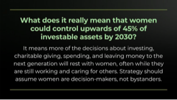 One study suggested that women may control as much as 45 percent of all investable assets in the U.S. and Europe by 2030.3